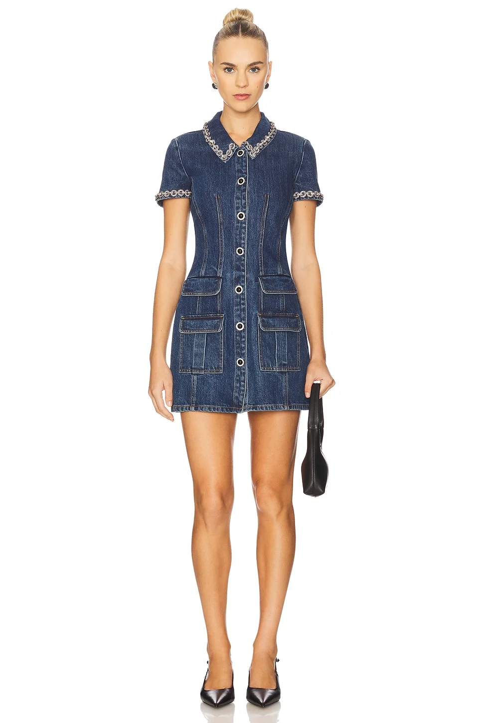 Denim Crystal Trim Collared Mini Dress