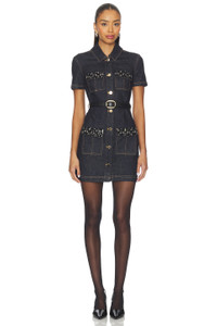 - Self 1: 94% cotton 5% polyester 1% elastane Self 2: 100% cow leather - Dry clean only - Unlined - Front button closure.4-front pocket design with rhinestone embellishment - Optional leather belt included - Denim fabric - Revolve Style No. SELF-WD317 - Manufacturer Style No. AW25-812S-BL