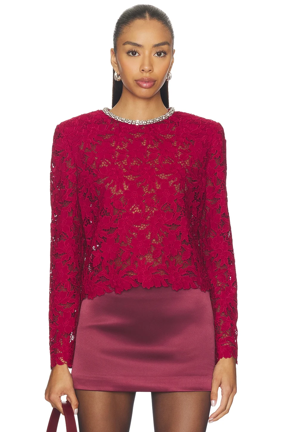 - Self: 100% polyester Lining: 100% polyamide - Made in China - Dry clean only - Back zip closure - Padded shoulders - Lightweight lace fabric - Plastic gem trim - Garment is intentionally sheer, undergarments will show through - Please note undergarment not included - Revolve Style No. SELF-WS61 - Manufacturer Style No. RS26-171T-R