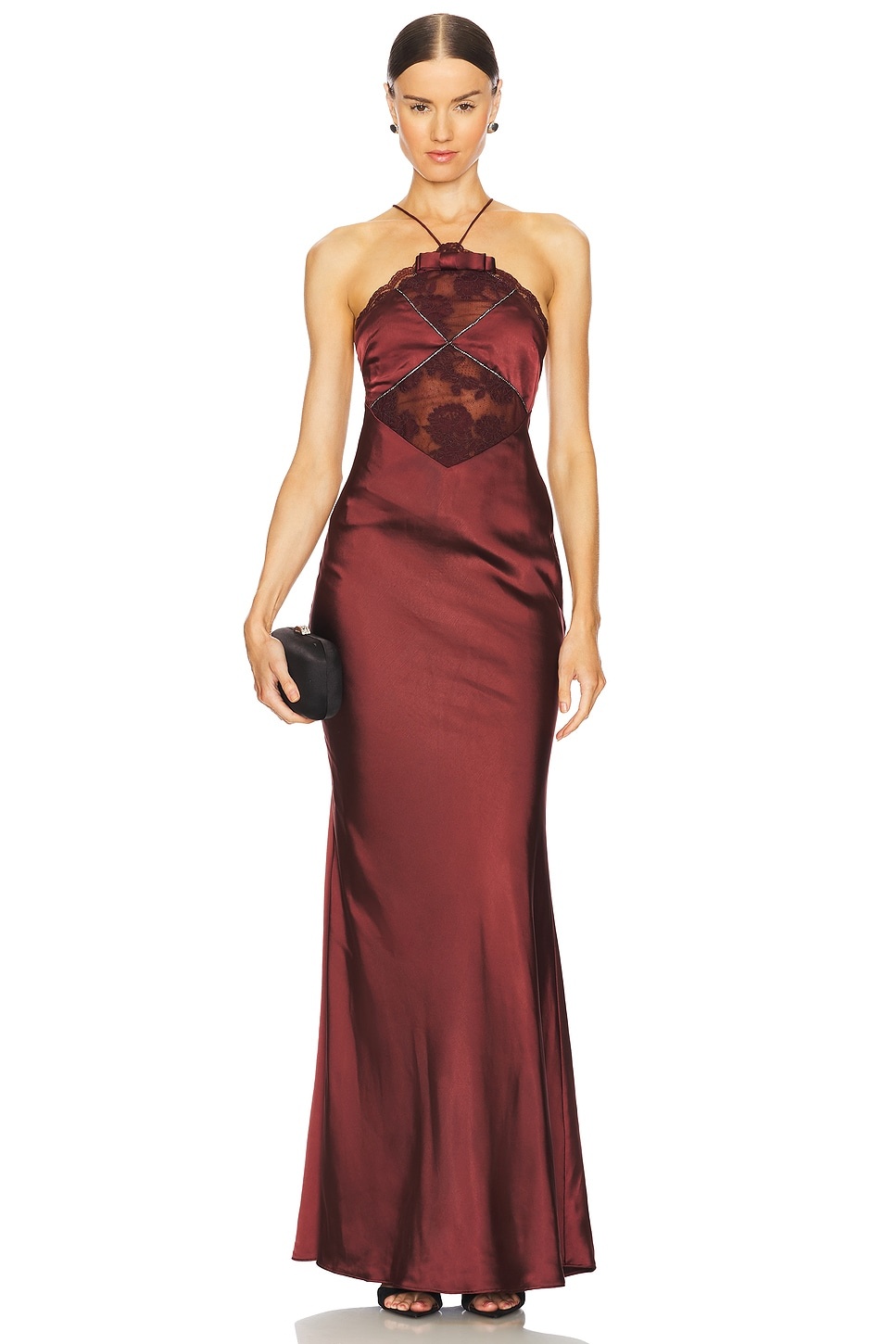 - Lightweight satin textile - Imported - Dry clean recommended - Fully lined - Pull-on styling - Halterneck design - Lightweight satin fabric with mesh panel - Revolve Style No. SELF-WD189 - Manufacturer Style No. RS25-081X-BR