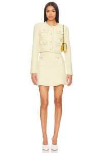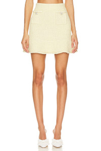 - 54% polyester 20% cotton 12% viscose 6% polyamide 5% wool 3% metallic fiber - Made in China - Dry clean only - Unlined - Pull-on styling with elastic waistband - Front slip pockets with button closure - Midweight knit fabric with metallic threading throughout Item not sold as a set - Skirt measures approx 17" in length - Revolve Style No. SELF-WQ12 - Manufacturer Style No. SS24-166SK-Y