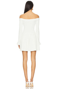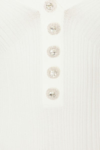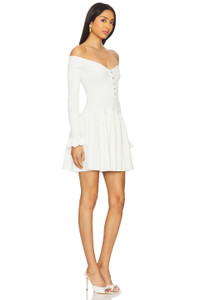 - Self 1: 50% viscose 32% polyester 16% polyamide 2% elastane Self 2: 50% viscose 39% polyester 11% polyamide - Dry clean only - Unlined - Pull-on styling - Off-shoulder styling - Decorative faux diamond buttons` - Midweight ribbed ponte fabric with flared cuffs - Neckline to hem measures approx 27" in length - Revolve Style No. SELF-WD250 - Manufacturer Style No. SS25-015S-W