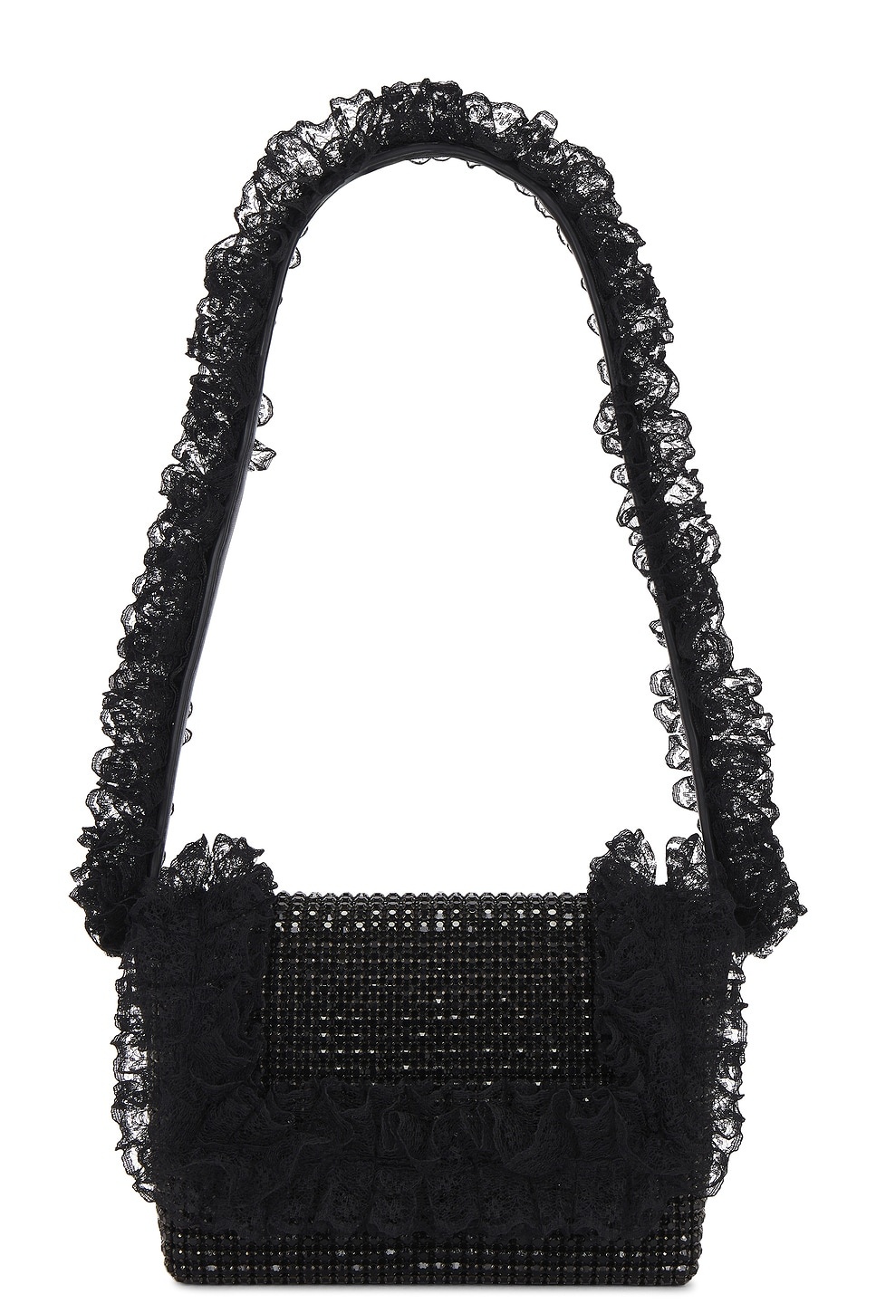 - Crystal embellished exterior with faux leather lining and lace trim - Made in China - Flap top with magnetic button closure - One main compartment - Interior card slot - Integrated shoulder strap - Measures approx 6.75" W x 4" H x 2" D Shoulder strap with a 10" drop - Revolve Style No. SELF-WY21 - Manufacturer Style No. SS25-CK-301-B