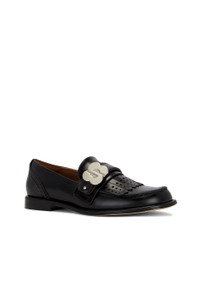 - Leather upper with leather sole - Slip-on styling - Leather footbed and lining - Penny loafer strap with novelty silver-tone metal hardware and fringed detailing at vamp - Rounded toe - Revolve Style No. SHUR-WZ1 - Manufacturer Style No. MWDEAC02