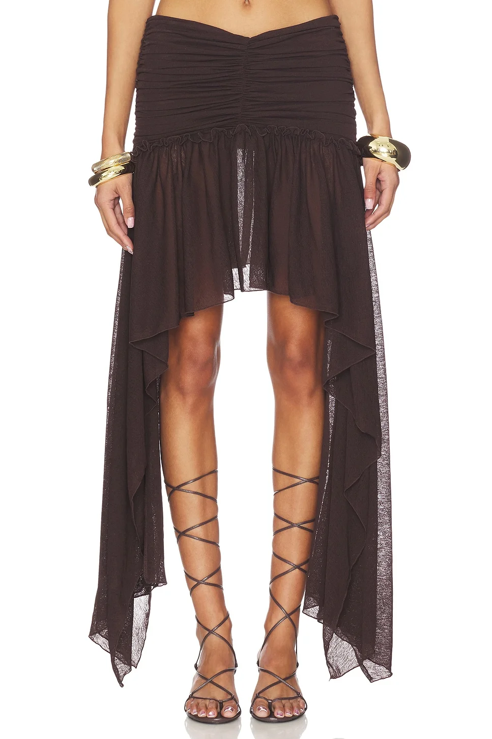 - 100% recycled polyester - Made in Turkey - Machine wash - Fully-lined - Pull-on styling - Lightweight crepe knit textile - Ruffle trims Ruched body Gathered hi-low skirt - Waist to shortest hem measures approx 16" and to longest hem approx 40" in length - Revolve Style No. SRER-WQ28 - Manufacturer Style No. WRS26SK10