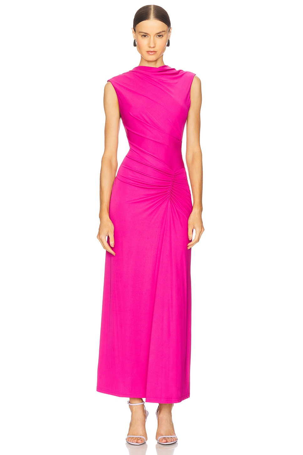 - Self: 96% rayon 4% spandex Lining: 94% rayon 6% spandex - Dry clean only - Fully lined - Pull-on styling - Front ruched detailing - Draped neckline detailing - Heavyweight slinky jersey fabric - Revolve Style No. JSKI-WD552 - Manufacturer Style No. 425-1075-D