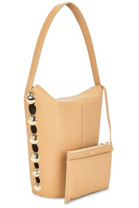- Leather exterior with suede lining - Foldover top with dual magnetic button closure - One main compartment - Detachable zippered pouch with 3 interior card slots and front slip pocket - Integrated shoulder strap with gold-tone domed studs and circular cut-outs - Measures approx 11" W x 11.5" H x 5.5" D Shoulder strap with a 9.5" drop Detachable pouch measures approx 7.5" W x 5" H - Revolve Style No. JSKI-WY38 - Manufacturer Style No. 425-H020-A