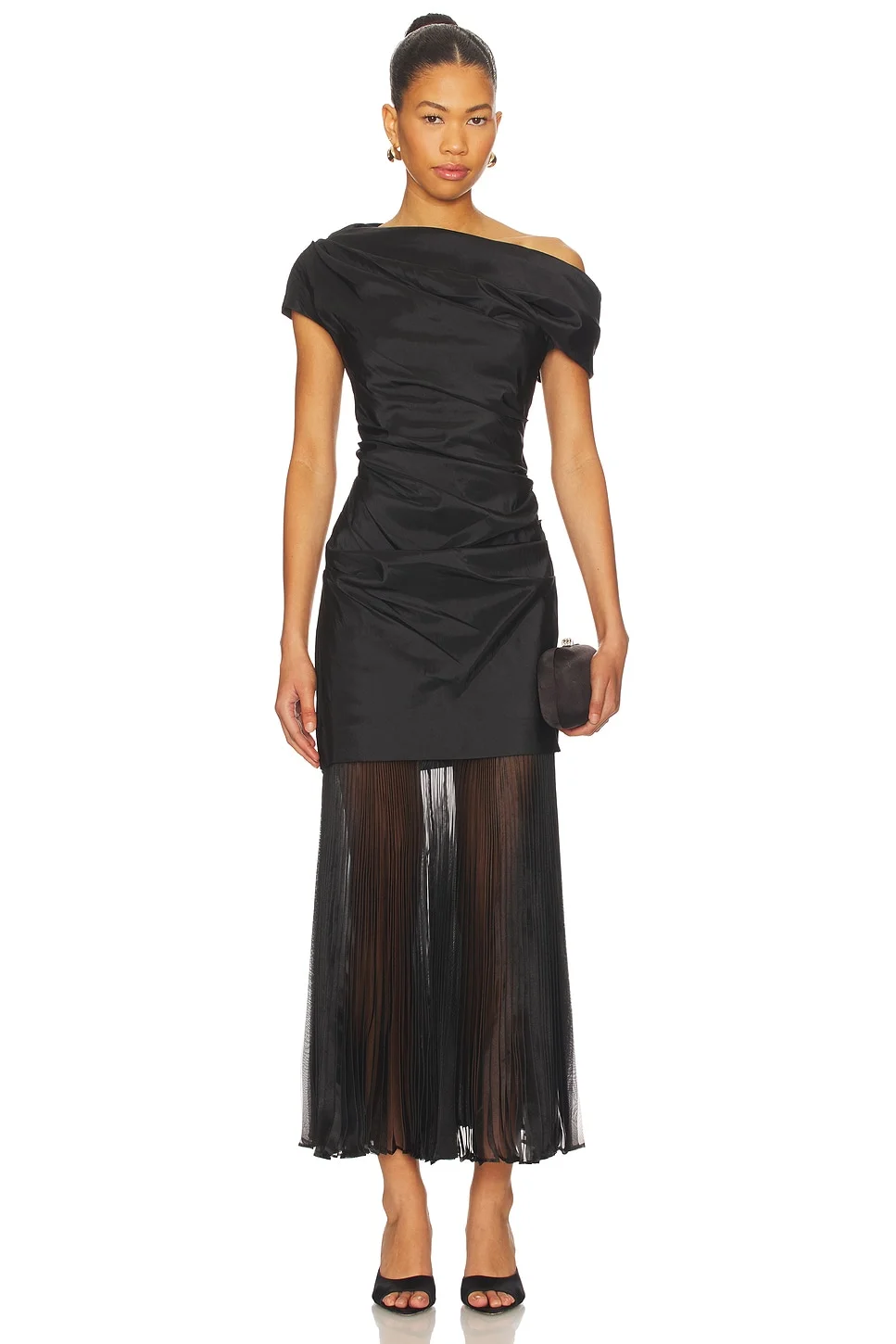 - Self 1: 60% polyester 40% nylon Self 2: 100% polyester Lining: 100% polyester - Made in China - Dry clean - Fully lined - Hidden side zipper closure - Taffeta textile - Draped body with contrast attached accordion pleated skirt - Revolve Style No. JSKI-WD591 - Manufacturer Style No. 625-1041-F