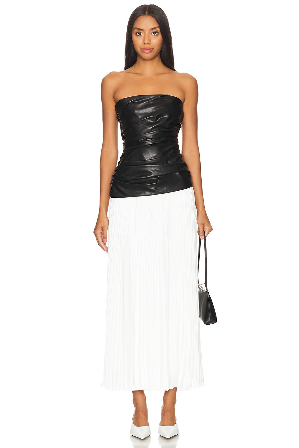 Arie ruched strapless faux leather and pleated crepe de chine midi dress