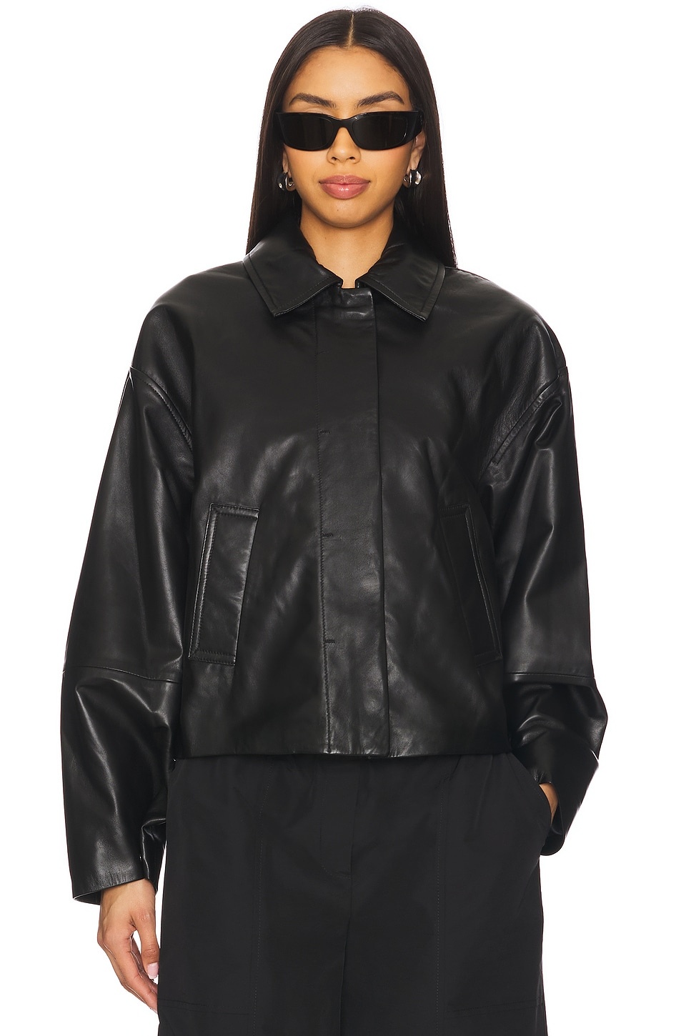 - Self: 100% leather Lining: 55% polyester 45% viscose - Made in Turkey - Professional leather clean only - Front zip with hidden button closure - Front angled pockets - Real leather exterior - Item not sold as a set - Revolve Style No. JSKI-WO63 - Manufacturer Style No. 225-6076-V