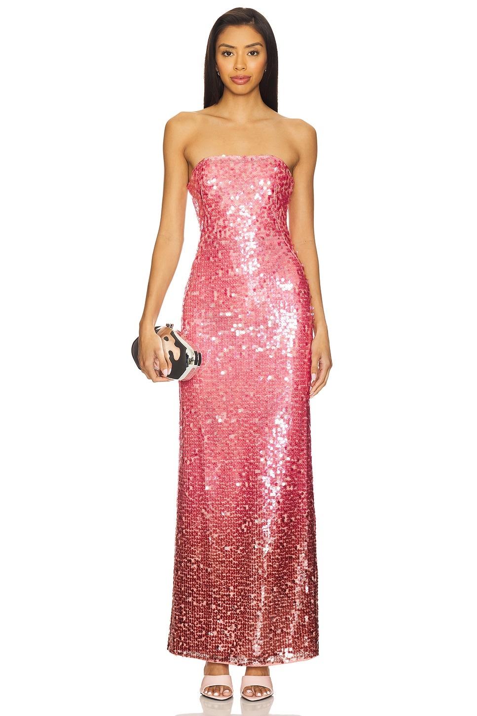 - Self & Lining 1: 96% nylon 4% polyester Lining 2: 85% polyester 15% spandex Contrast Fabric: 49% viscose 51% rayon - Dry clean only - Fully lined - Concealed back zipper with hook and eye closure - Back vent - Midweight sequin-embellished fabric - Neckline to hem measures approx 54" in length - Revolve Style No. JSKI-WD522 - Manufacturer Style No. 325-1059-E