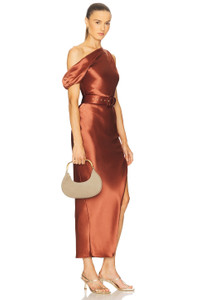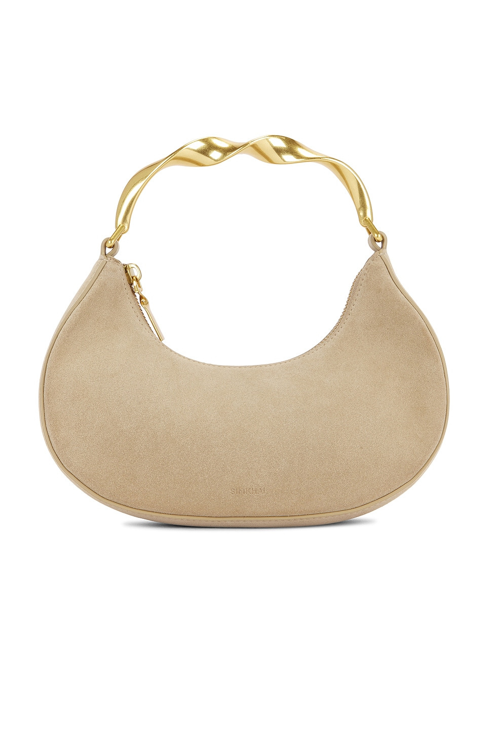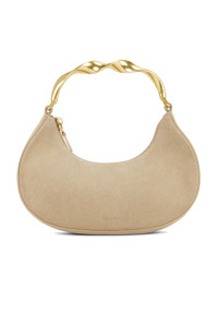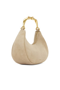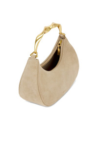 - Suede exterior with textile lining - Top zipper closure - One main compartment - Integrated gold-tone metal top handle - Measures approx 9" W x 4" H x 3" D Top handle with a 5" drop - Revolve Style No. JSKI-WY33 - Manufacturer Style No. 425-H004-N-SUE