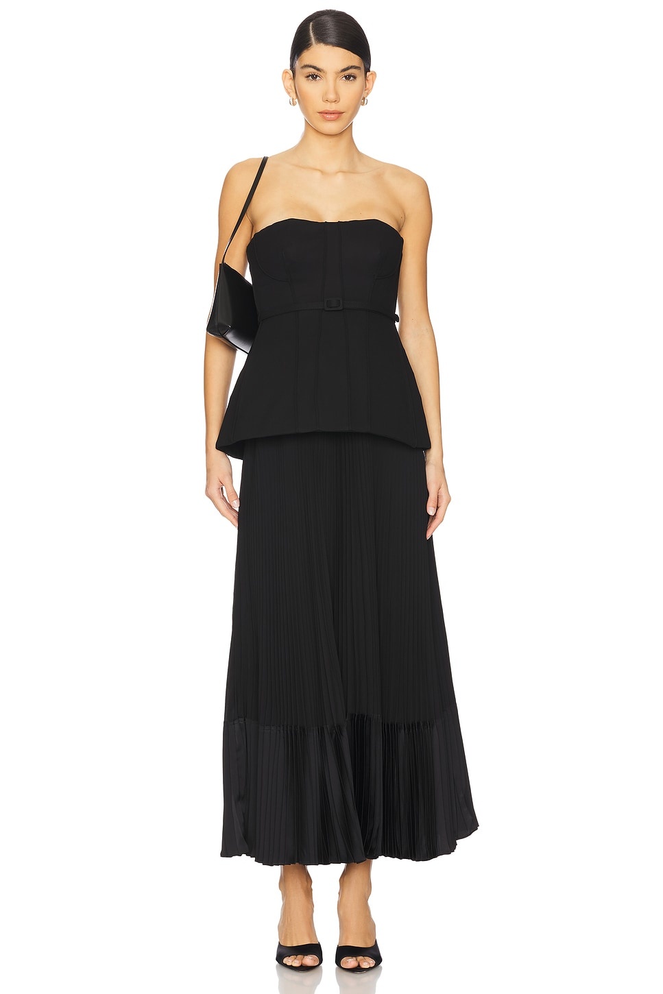 - Self: 71% acetate 29% polyester Contrast Fabric 1 & Lining: 100% polyester Contrast Fabric 2: 85% nylon 15% elastane - Made in China - Machine wash - Fully lined - Hidden back zipper closure and optional waist belt - Boned bodice - Heavyweight crepe bodice and pleated skirt detail - Neckline to hem measures approx 47" in length - Revolve Style No. JSKI-WD483 - Manufacturer Style No. 125-1142-Q