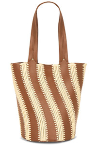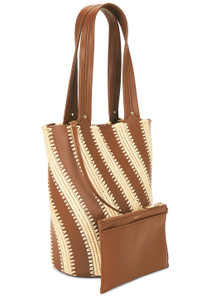 - Leather and raffia exterior and interior - Top magnetic button closure - One main compartment - Detachable zippered pouch with 3 interior card slots and front slip pocket - Integrated shoulder straps - Measures approx 8" W x 11" H x 8" D Shoulder strap with a 9" drop Detachable pouch measures approx 7.5" W x 5" H - Revolve Style No. JSKI-WY39 - Manufacturer Style No. 425-H025-TL