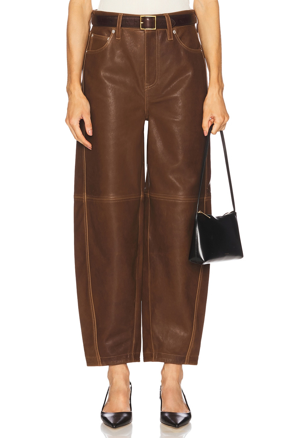- Self: 100% leather Lining: 100% polyester - Professional leather clean only - Zip fly with button closure.5-pocket styling - Cropped design - Belt loops - Heavyweight leather fabric.22" at the knee narrows to 14" at the leg opening - Revolve Style No. JSKI-WP109 - Manufacturer Style No. 425-4104-V