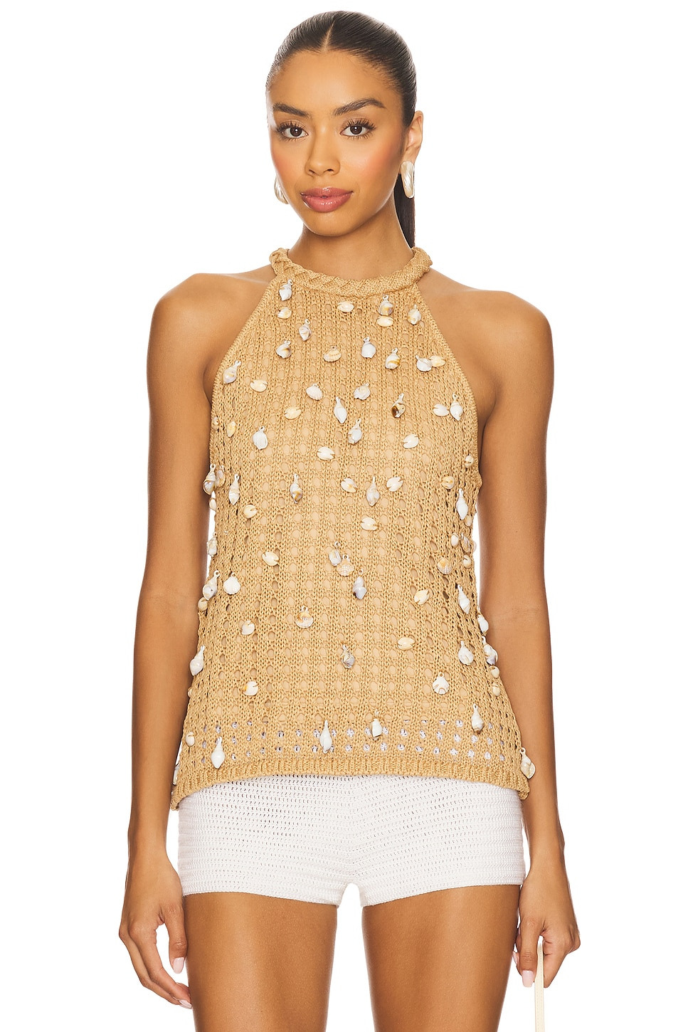 - Self: 65% polyester 35% cotton Contrast Fabric: 100% acrylic - Hand wash cold - Back button loop closure with keyhole design - Crochet knit fabric with seashell embellishments - Revolve Style No. SIMO-WS74 - Manufacturer Style No. W7274-4139