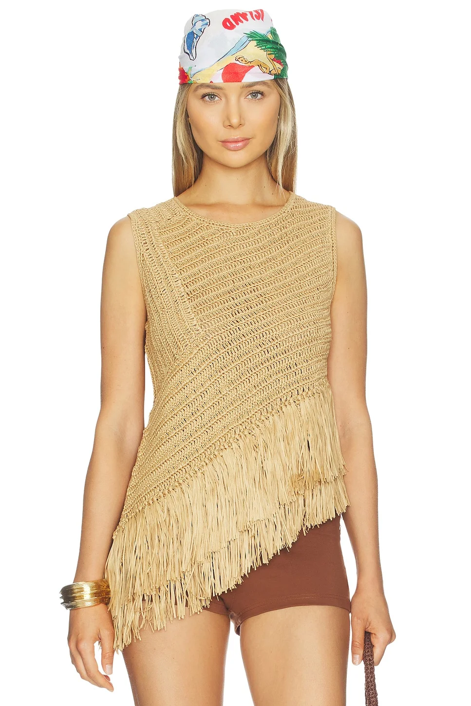 - 65% polyester 35% cotton - Dry clean only - Pull-on styling - Asymmetrical fringed hem - Heavyweight woven raffia fabric - Garment is made with a semi-sheer fabric, undergarments can show through - Revolve Style No. SIMO-WS92 - Manufacturer Style No. W7261-4139