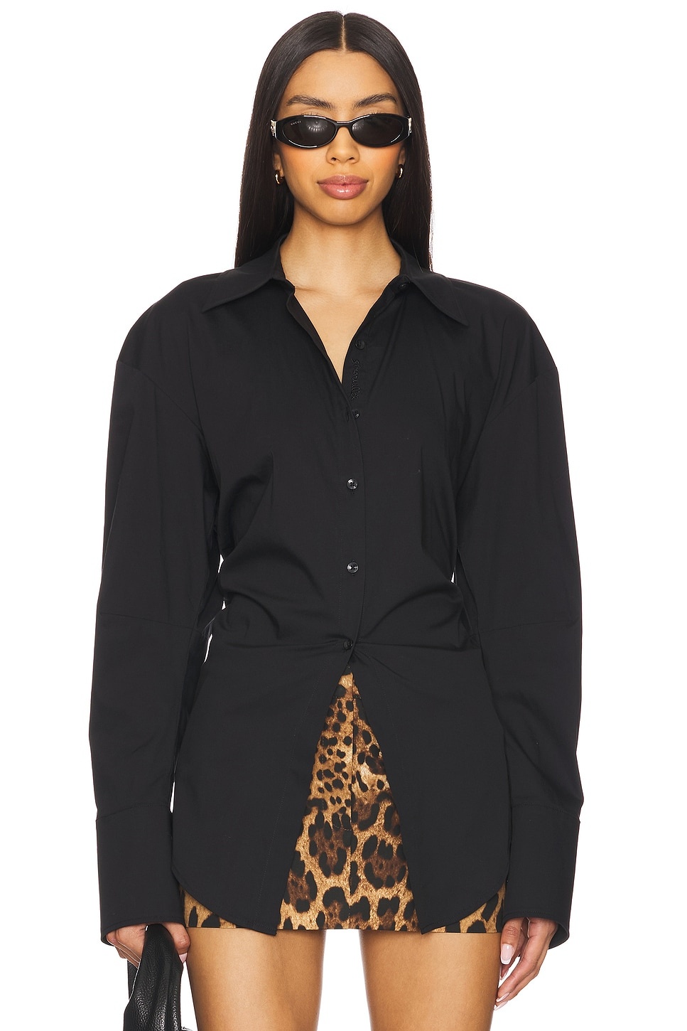 - 75% cotton 22% nylon 3% spandex - Made in China - Dry clean - Front button closure with wraparound tie detail - Back cut-out - Poplin fabric with split button cuffs - Revolve Style No. SIMO-WS67 - Manufacturer Style No. W3279-3169