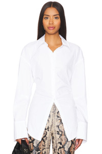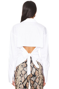 - 75% cotton 22% nylon 3% spandex - Made in China - Machine wash - Front button closure - Button cuffs - Back cut-out with tie detail - Lightweight poplin fabric - Revolve Style No. SIMO-WS61 - Manufacturer Style No. W3279-3169-10608