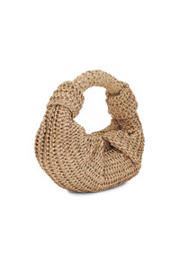 - Woven raffia exterior with satin lining - Made in China - Invisible magnetic closure - One main compartment - Knotted detail at top handle - Measures approx 9" W x 5.1" H x 2.4" D Top handle with a 3.9" drop - Revolve Style No. SIMO-WY70 - Manufacturer Style No. S849-9175