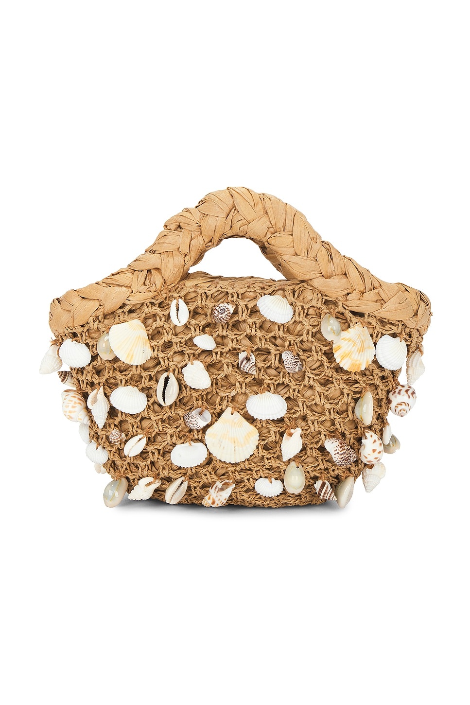 - Unlined woven raffia exterior with leather insert - Made in India - Open top styling - One main compartment - Dual top handles - Natural shell embellished exterior - Measures approx 13.39" W x 6.5" H x 3.54" D Top handle with a 2" drop - Revolve Style No. SIMO-WY88 - Manufacturer Style No. S1053-9152