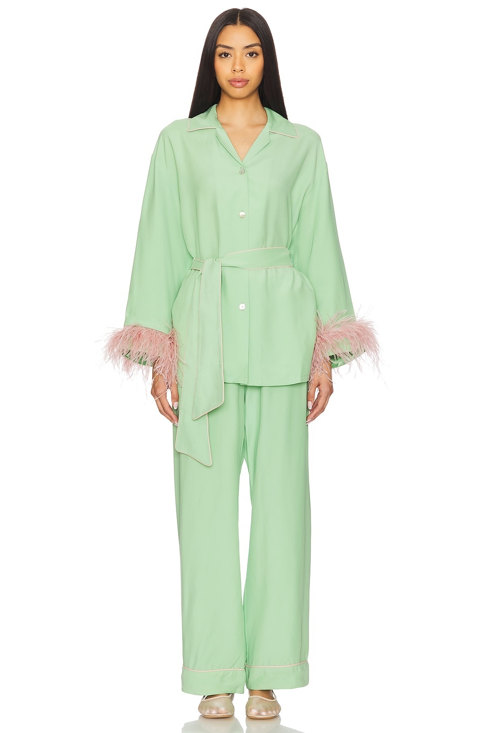 - Self: 100% viscose Contrast Fabric: 65% polyester 35% cotton Trim: 100% ostrich feathers - Made in Ukraine - Dry clean - Top: Front button closure Pants: Pull-on styling - Detachable waist tie and feather trim - Midweight satin fabric - Sold as a set - Revolve Style No. SEPE-WI33 - Manufacturer Style No. MCSP03P008F
