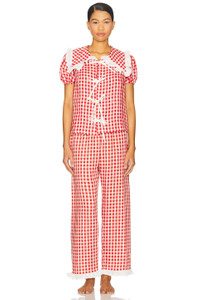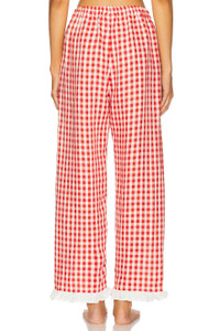 - Self: 50% linen 50% viscose Contrast Fabric: 100% linen - Dry clean only - Pull-on styling with elastic waistband - Midweight linen fabric with ruffled trim - Item not sold as set.21" at the knee narrows to 19" at the leg opening - Revolve Style No. SEPE-WI34 - Manufacturer Style No. PFPT01G015R