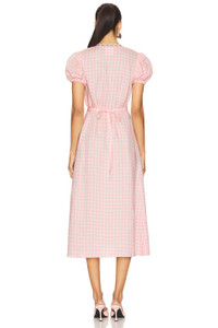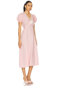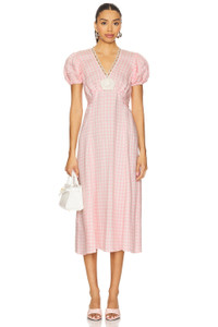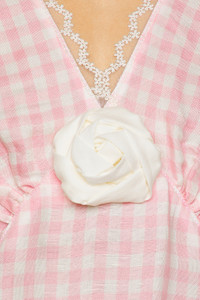 - Self: 50% linen 50% viscose Contrast Fabric: 100% cotton - Dry clean only - Unlined - Pull-on styling - Back tie closure - Front 3D rosette accent and scalloped lace trim - Midweight linen fabric - Revolve Style No. SEPE-WD24 - Manufacturer Style No. GRDR01G019R