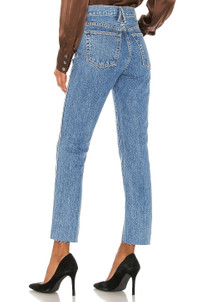 - 100% cotton - Light fading and distressed detail - Zip fly with button closure.5-pocket design - Raw cut hem.14" at the knee and 14" at the leg opening - Made in USA - Revolve Style No. SLKE-WJ3 - Manufacturer Style No. HROJ707S