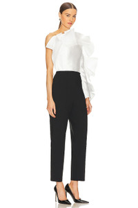 - Self: 100% polyester Lining: 95% polyester 5% elastane - Made in China - Dry clean only - Hidden back zipper closure - One-shoulder styling - Ruffled fabric trims - Neckline to hem measures approx 48" in length 19" at the knee narrows to 13" at the leg opening - Revolve Style No. SOLA-WC13 - Manufacturer Style No. OS39027