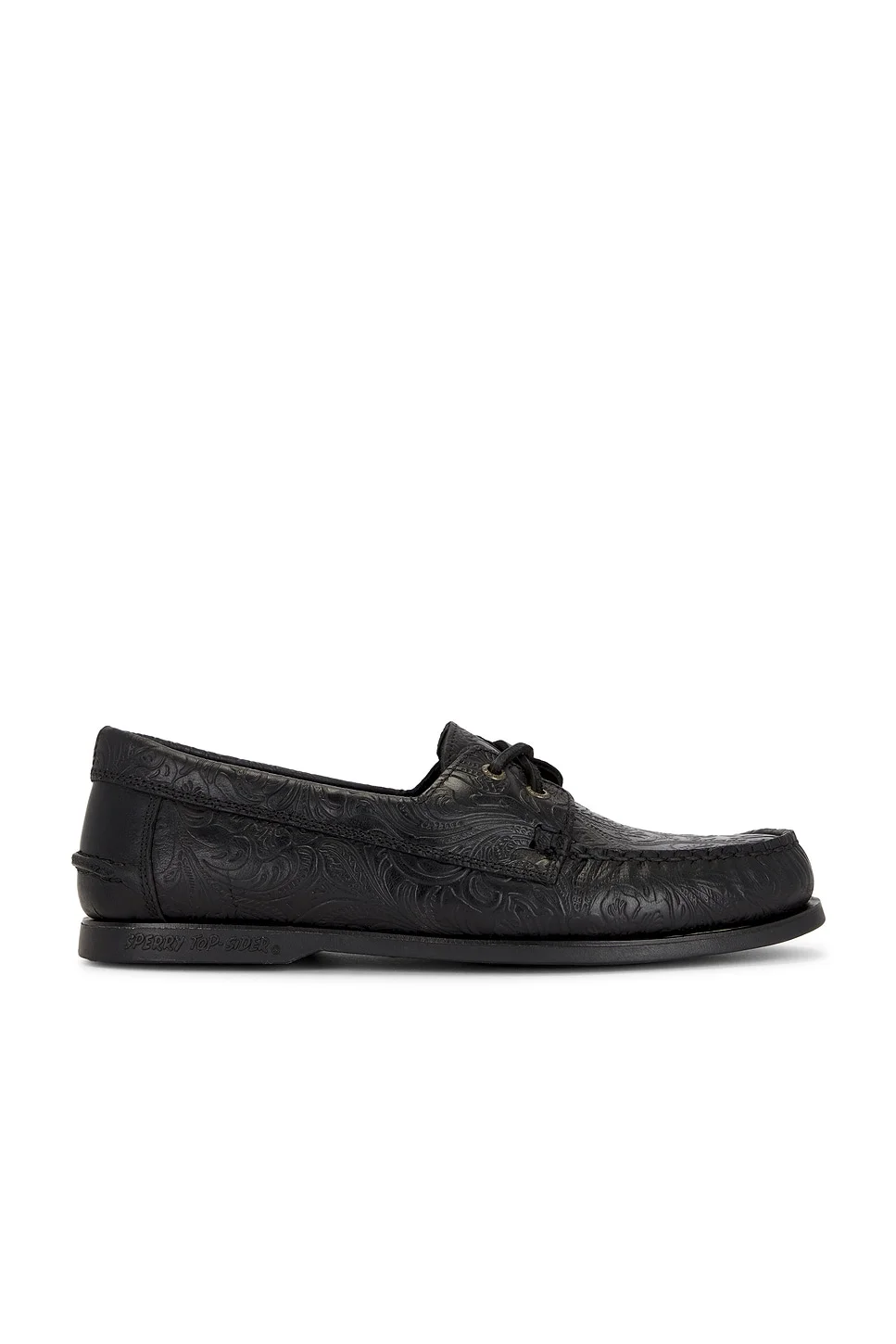 - Sperry x One of these Days Leather upper and rubber sole - Slip-on styling - Leather lining and footbed - Embossed detail throughout - Stitched 2-eyed moccasin design - Round toe - Revolve Style No. SRRY-MZ4 - Manufacturer Style No. 14182701