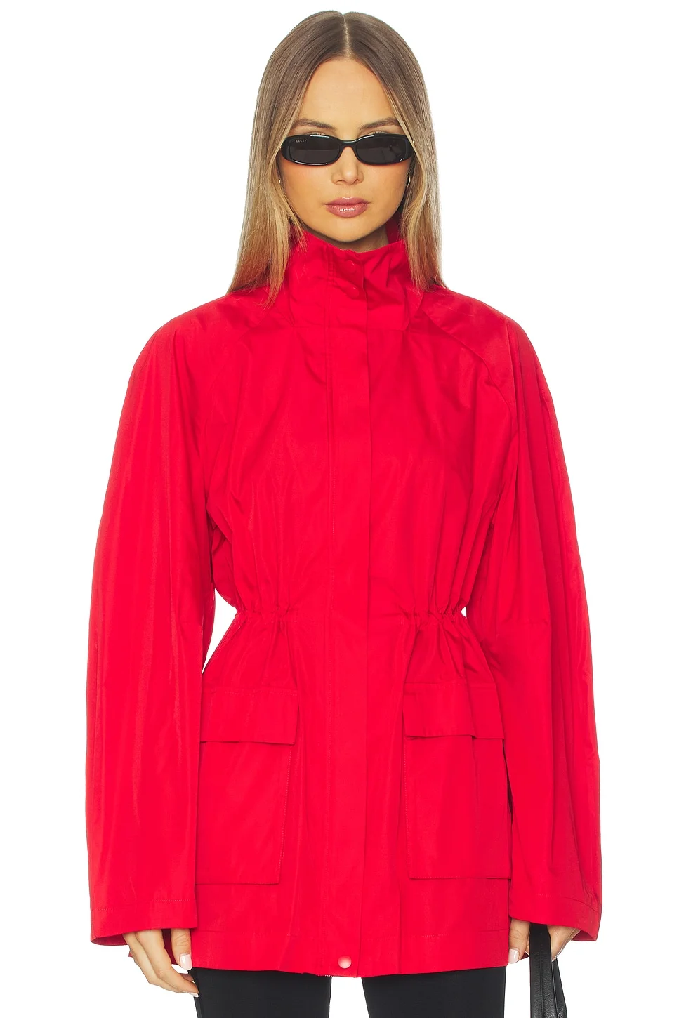 - 80% recycled polyamide 20% silk - Dry clean only - Hidden Front zipper closure with button snap closure at collar - Stand collar design - Elasticized waist - Front lower flap pocket design - Ripstop fabric - Revolve Style No. SAGN-WO11 - Manufacturer Style No. W25-306RED