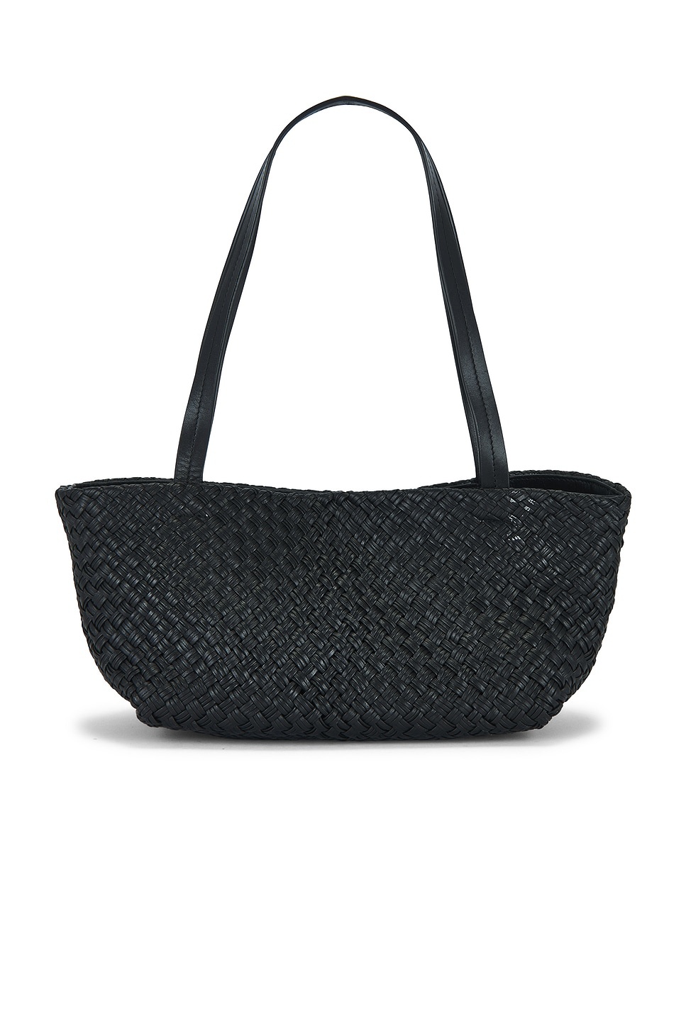 - Woven lambskin leather exterior with goatskin suede lining - Magnetic closure - One main compartment - Measures approx 15" W x 5.5" H x 5.5" D Shoulder strap with a 9" drop - Revolve Style No. SAGN-WY34 - Manufacturer Style No. S25-010BLK