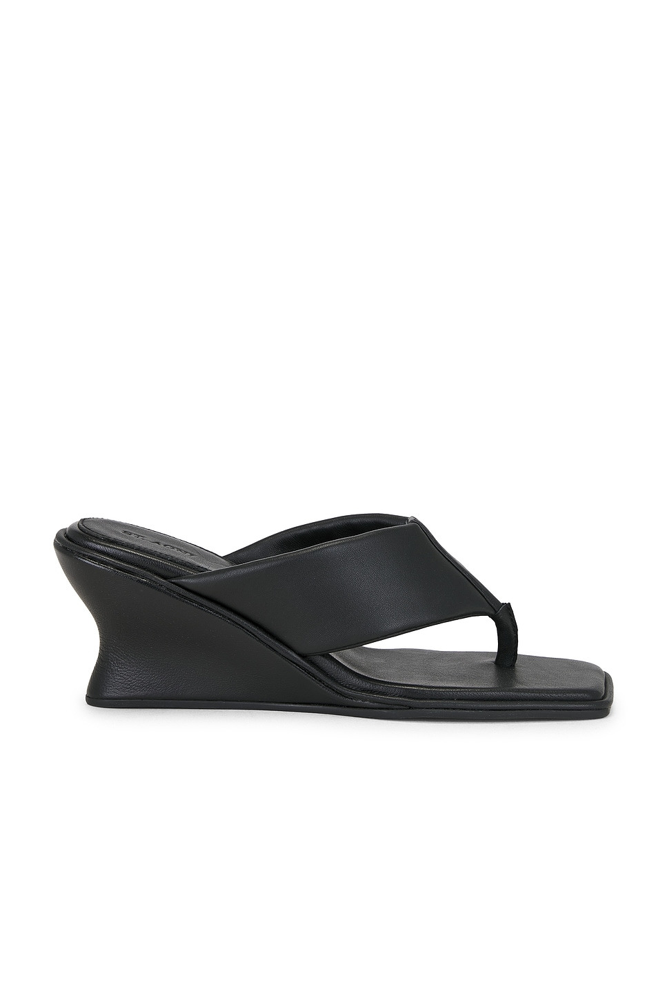 - Sheep leather upper with rubber sole - Slip-on styling - Sheep leather footbed and lining - Thong design - Square toe - Approx 70mm/ 2.75 inch wedge - Revolve Style No. SAGN-WZ32 - Manufacturer Style No. S25-101BLK