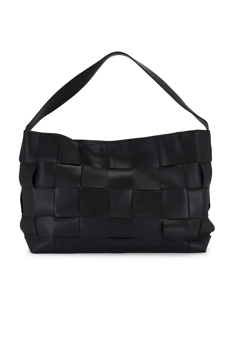 - Woven leather exterior with suede lining - Made in India - Top magnetic button closure - One main compartment - Interior slip pocket - Integrated leather shoulder strap - Measures approx 16" W x 12" H x 5" D Shoulder strap with a 8" drop - Revolve Style No. SAGN-WY30 - Manufacturer Style No. S24-002BLK