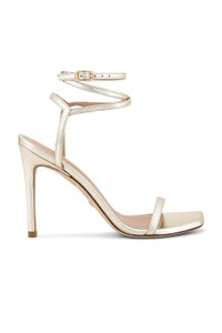 - Metallic leather upper, lining, and sole - Made in Spain - Wrap ankle with buckle closure - Rounded open toe styling - Approx 100mm/ 4 inch heel - Revolve Style No. STUA-WZ533 - Manufacturer Style No. SD600