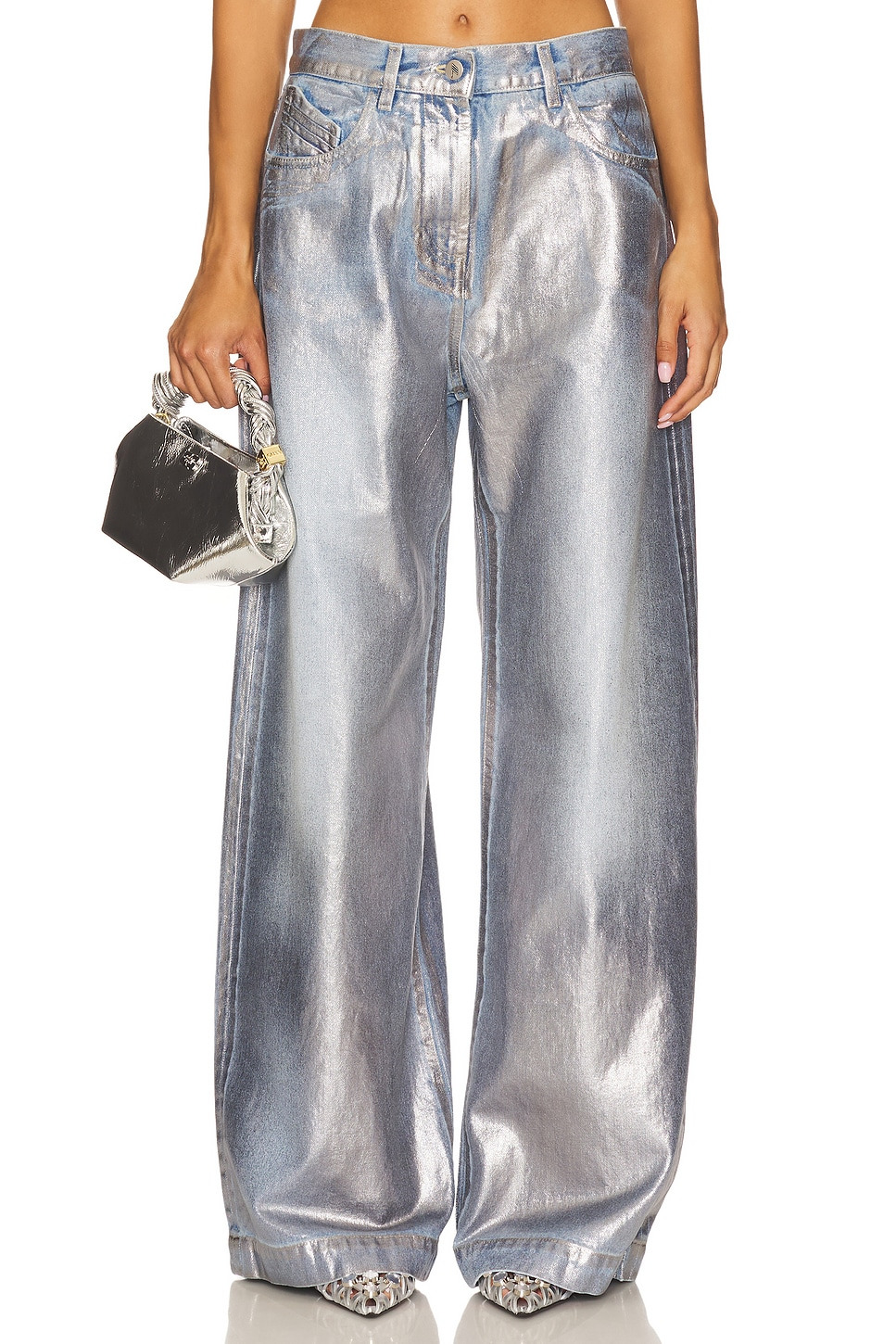 - Self: 100% cotton Lining: 65% polyester 35% cotton - Hand wash - Zip fly with button closure.5-pocket styling - Logo patch at back waist - Low-rise fit - Metallic coated rigid denim.24" at the leg opening - Revolve Style No. ATTF-WJ33 - Manufacturer Style No. 251WCP00276