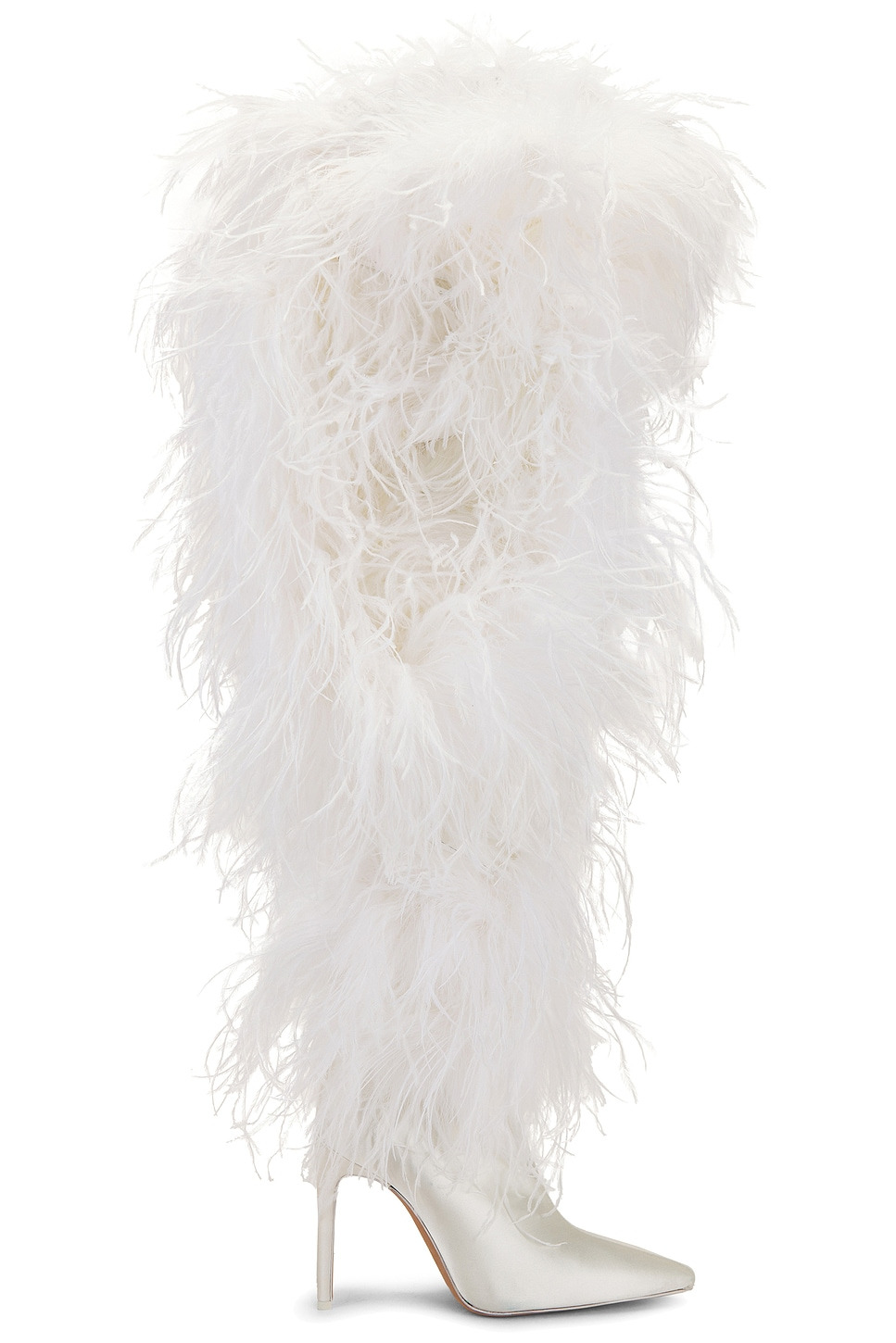 - Ostrich feather embellished satin upper with leather sole - Made in Italy - Pull-on styling - Leather footbed and lining - Pointed toe with stiletto heel - Approx 110mm/ 4.33 inch heel Approx 584mm/ 23 inch shaft Shaft measures approx 21.98" in circumference - Revolve Style No. NARR-WZ7 - Manufacturer Style No. OVERTHEKNEEBOOTS110