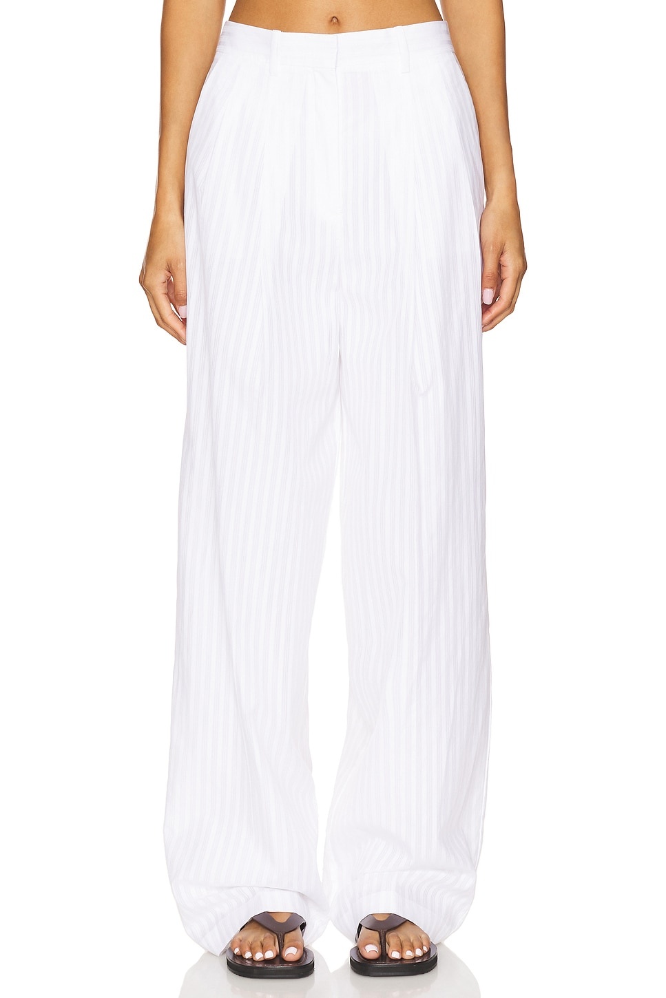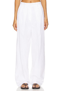- Self: 100% cotton Lining: 69% cotton 27% nylon 4% elastane - Dry clean only - Zip fly with double hook and bar closure - Side seam and back button pockets - Pleated design - Midweight linen fabric - Garment is made with a semi-sheer fabric, undergarments can show through.24" at the knee narrows to 20" at the leg opening - Revolve Style No. THEO-WP303 - Manufacturer Style No. P0404202