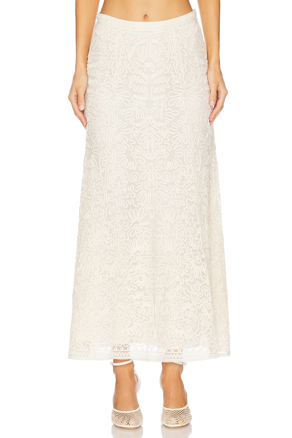 - Self: 100% nylon Lining: 100% cotton Trim: 100% polyester - Dry clean only - Fully lined - Concealed side zipper with hook and eye closure - Lightweight mesh fabric with embroidered geometric design - Item not sold as a set - Skirt measures approx 37" in length - Revolve Style No. ULLA-WQ48 - Manufacturer Style No. SP250330