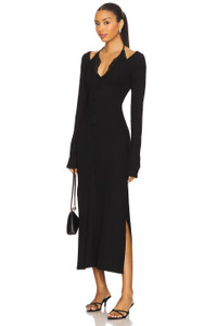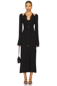 - 95% cupro 5% elastane - Dry clean only - Unlined - Front button closure - Layered styling with halterneck - Side seam slits - Midweight ribbed jersey fabric - Revolve Style No. VLAR-WD13 - Manufacturer Style No. KN005