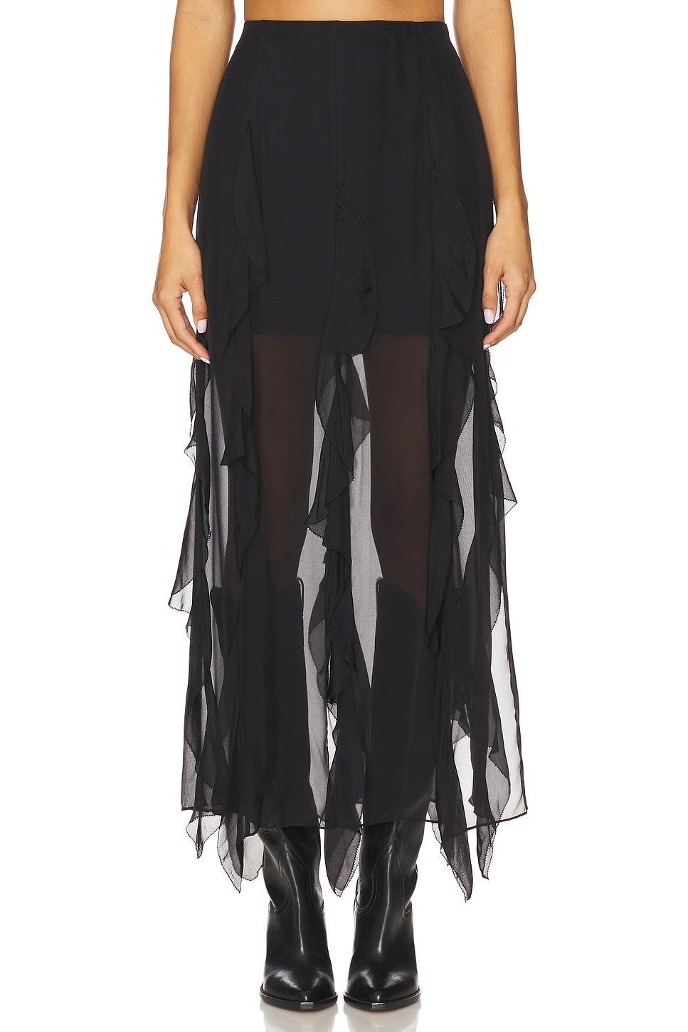 - Self: 100% Silk Principal: 100% Sole Lining: 100% Polyester Doubleure: 100% Polyester - Dry clean only - Hidden side zipper closure - Partially lined - Lightweight flowy voile fabric - Skirt measures approx 37" in length - Revolve Style No. VBRD-WQ59 - Manufacturer Style No. 2509CH3830641