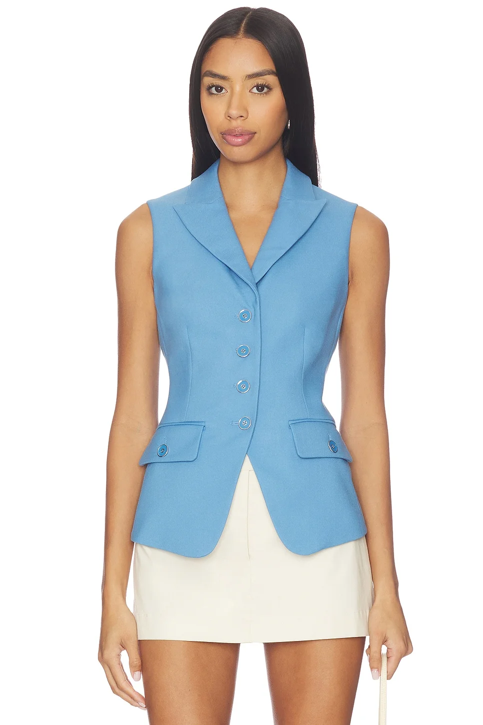 - Self: 63% polyester 34% viscose 3% elastane Lining: 100% polyester - Made in USA - Dry clean - Front button-down closure - Buttoned flap-pockets at front - Midweight woven textile - Peaked collar - Revolve Style No. VBRD-WS259 - Manufacturer Style No. 2512SU11311193