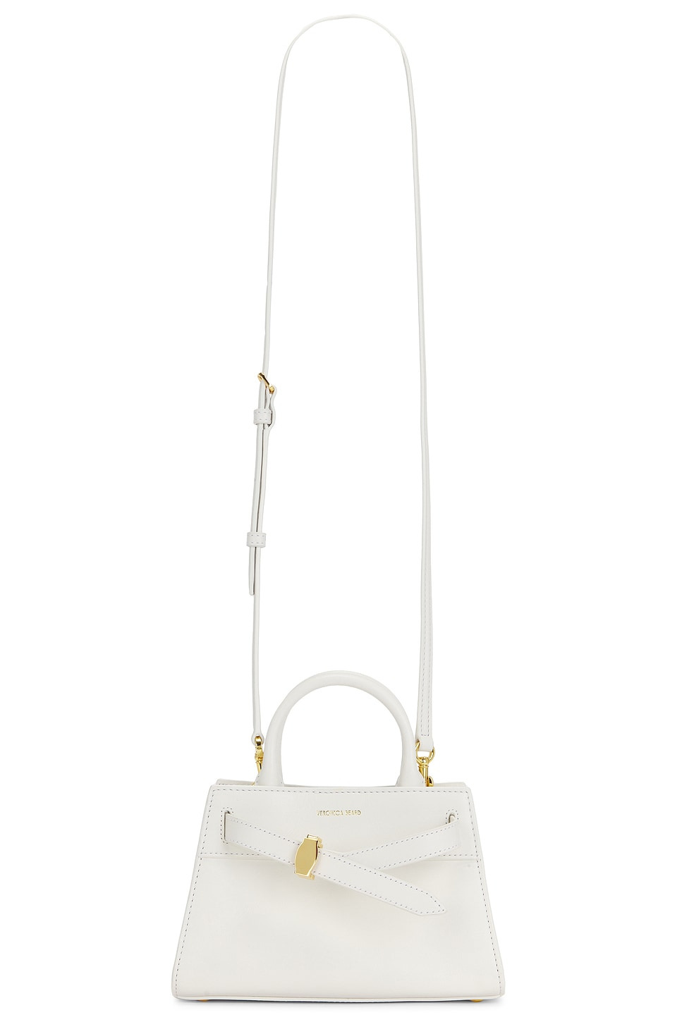 - Leather exterior with microfiber lining - Top magnetic button closure - One main compartment - Interior slip pocket - Buckled strap at front with gold-tone hardware - Detachable and adjustable leather shoulder strap - Measures approx 8.5" W x 5.5" H x 4" D Shoulder strap with a 21.5" drop Top handle with a 3" drop - Revolve Style No. VBRD-WY17 - Manufacturer Style No. H2505HL101V014