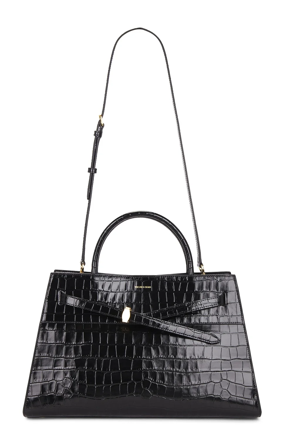 - 100% leather exterior with croc-embossed texture - Microsuede / polyester lining - Magnetic snap flap closure - One main compartment - Interior zip pocket - Measures approx 16.9" W x 6.3" D x 10.2" H Handle drop approx 4.7" Strap drop approx 21.7" - Revolve Style No. VBRD-WY35 - Manufacturer Style No. H2510HL115Z055