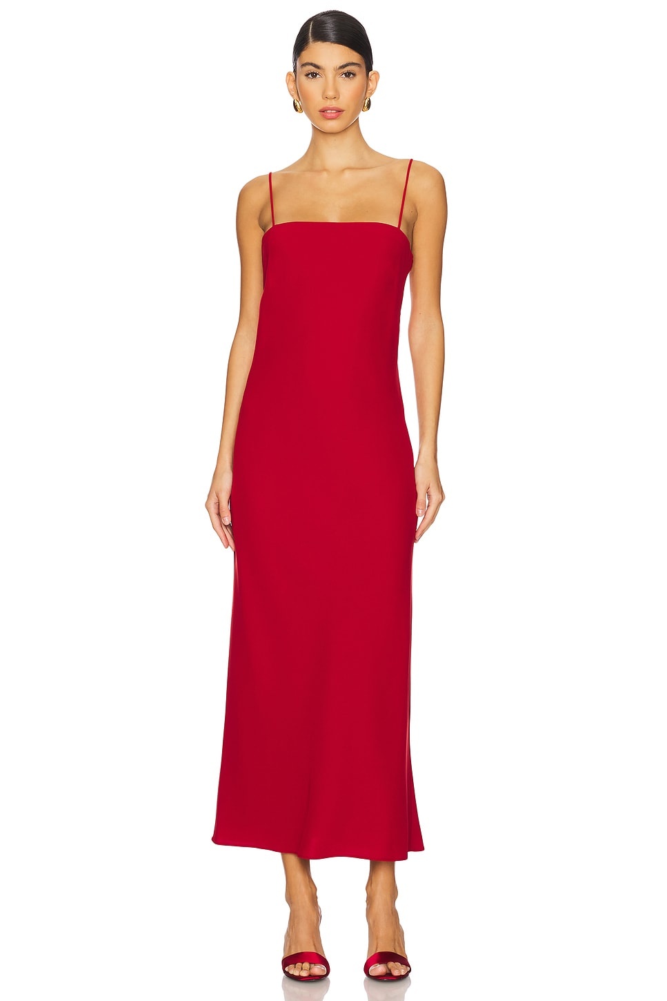 - Self: 65% triacetate 35% polyester Lining: 100% polyester - Made in USA - Dry clean only - Fully lined - Hidden side zip closure - Adjustable shoulder straps - Midweight satin fabric - Revolve Style No. VBRD-WD181 - Manufacturer Style No. 2410CP2121193