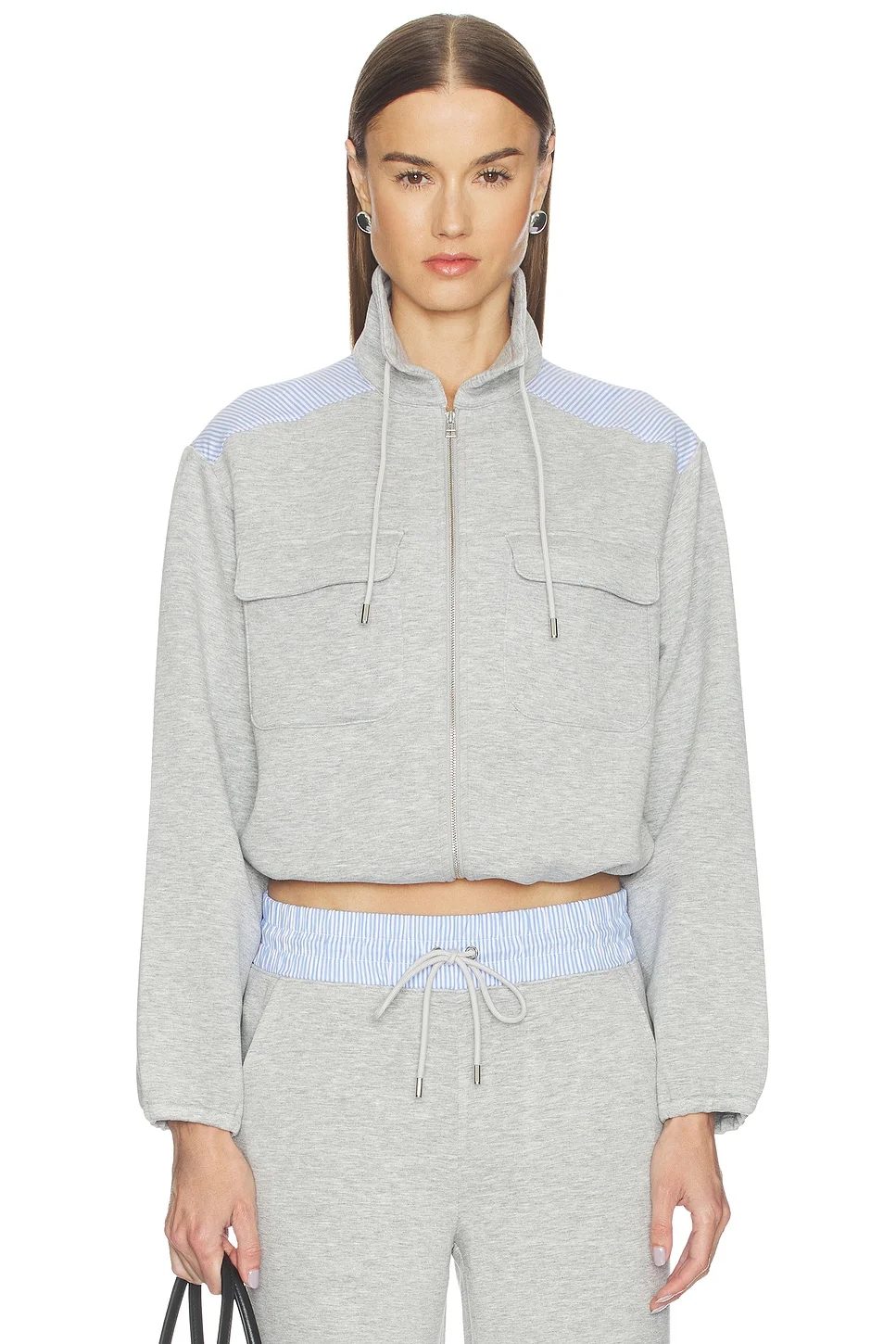 - Self: 77% rayon 14% polyester 9% elastane Combo: 100% cotton - Made in Vietnam - Machine wash cold - Front zip closure - Drawcord fastener - Midweight fleece fabric - Front patch pockets - Elasticized waistband - Revolve Style No. VBRD-WK96 - Manufacturer Style No. J2602JY20011465