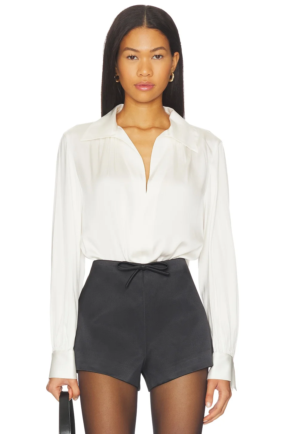 - 55% silk 38% viscose 7% spandex - Made in China - Hand wash cold - Pull-on styling - Lightweight satin fabric - Button closure on cuffs - Revolve Style No. VINCE-WS1176 - Manufacturer Style No. V133613139