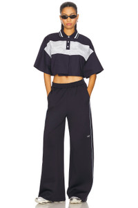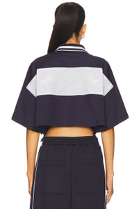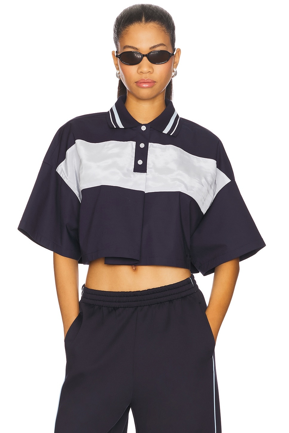 - 68% rayon 28% polyester 4% polyurethane Contrast Fabric 1: 100% rayon Contrast Fabric 2: 100% cotton - Dry clean only - Partial front button closures and adjustable tie closures at hems - Ribbed contrast collar - Cropped styling - Midweight poplin-blend fabric - Revolve Style No. WE1R-WS1 - Manufacturer Style No. WD-BL1-25-132-W-NV
