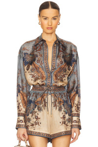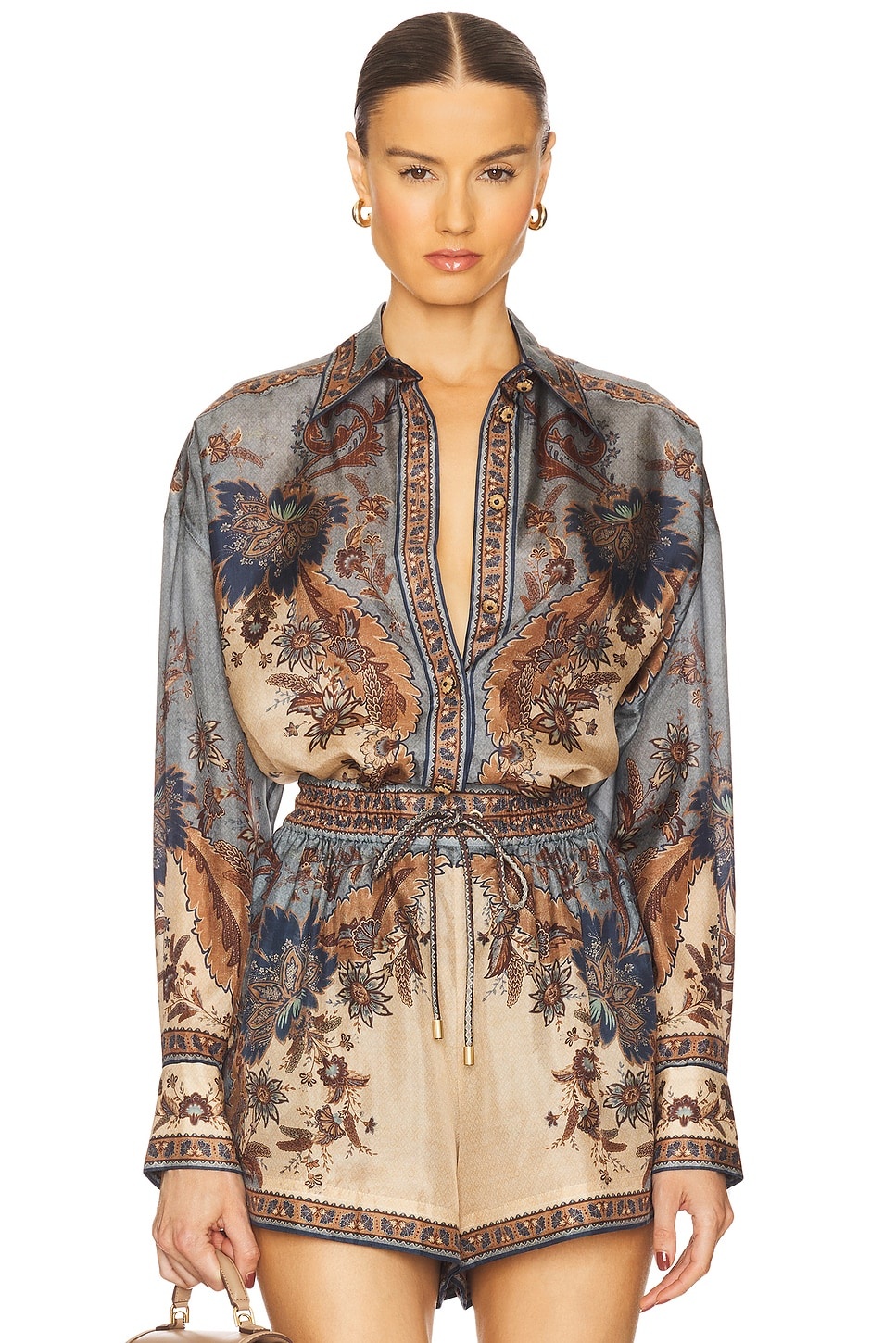 - 100% silk - Dry clean only - Partial front button closures - Collared styling - Button cuffs - Lightweight satin fabric - Item not sold as set - Revolve Style No. ZIMM-WS229 - Manufacturer Style No. 3498TSS253